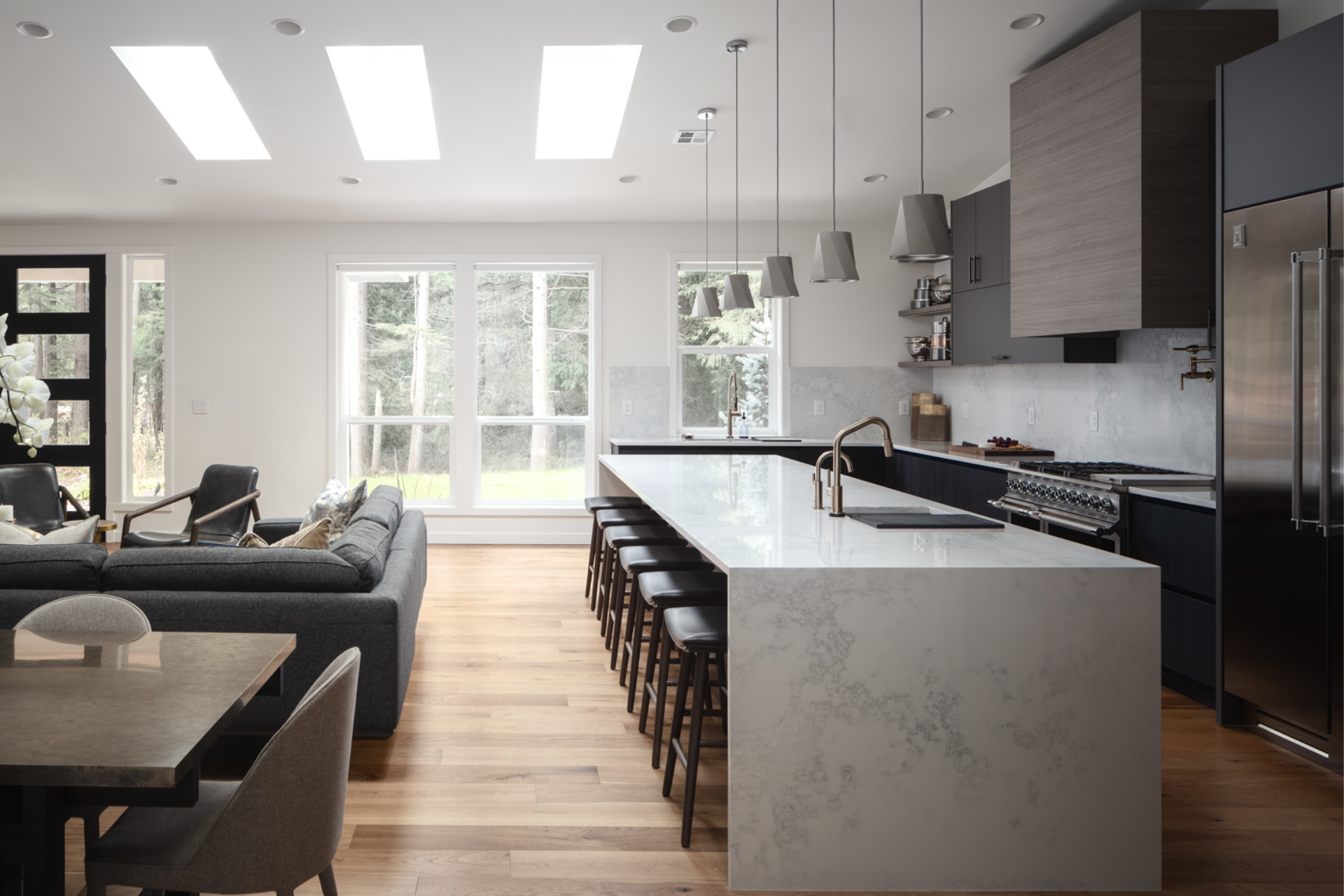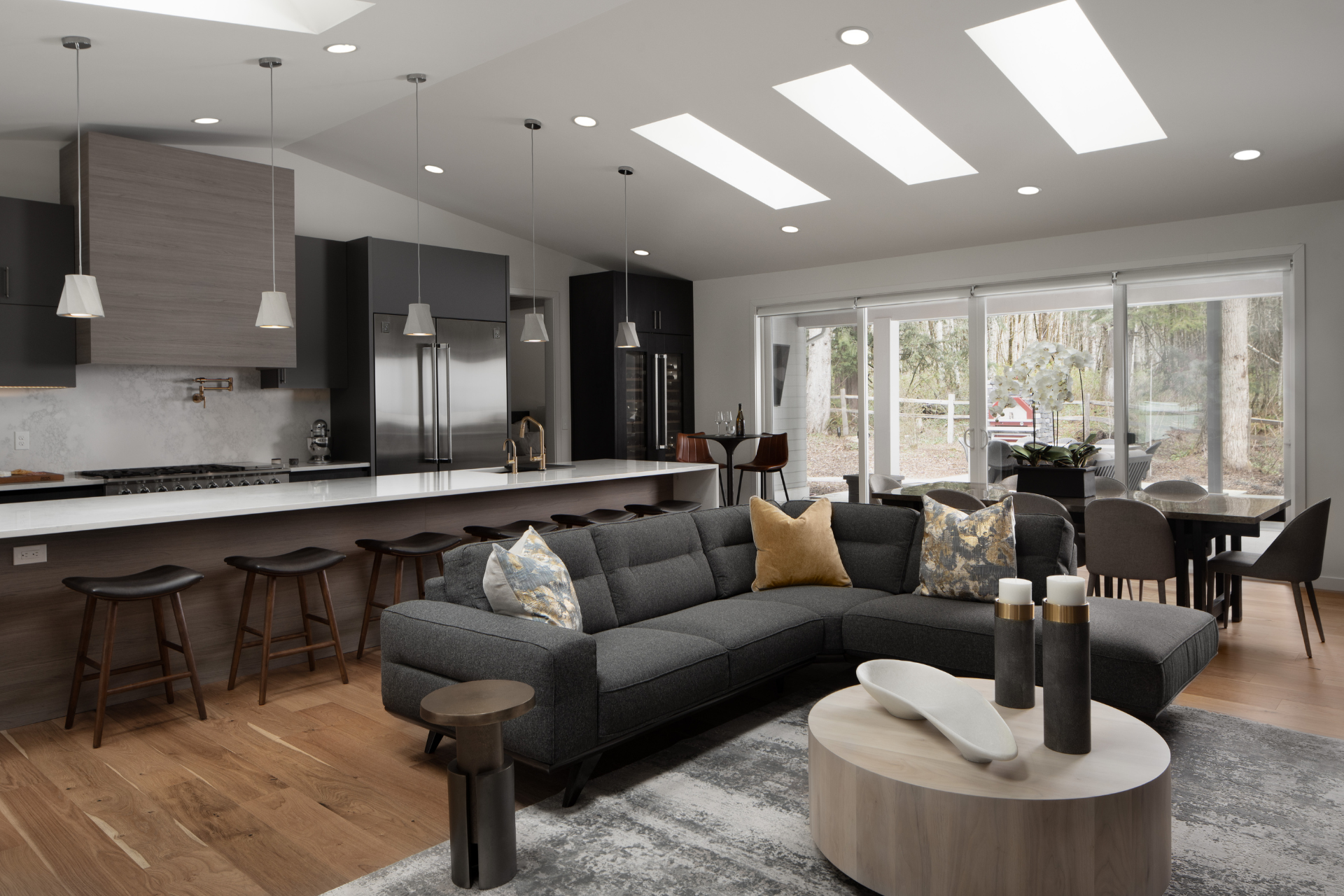 Luxurious lounge living space seamlessly integrated with a sophisticated kitchen, bringing contemporary elegance and functionality. This space harmoniously blends sleek, modern design with comfort, creating an ambiance that caters to both relaxation and culinary indulgence.