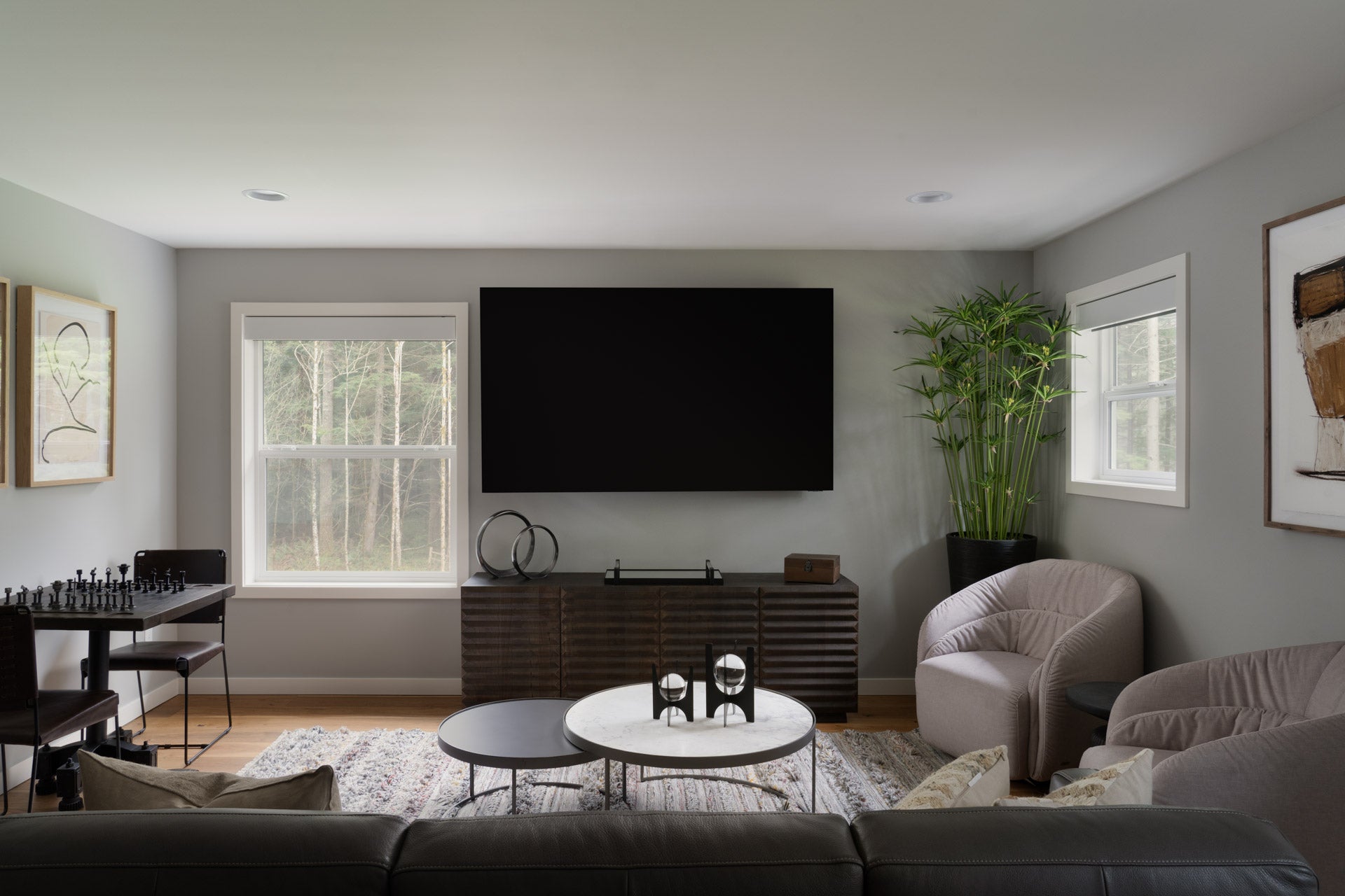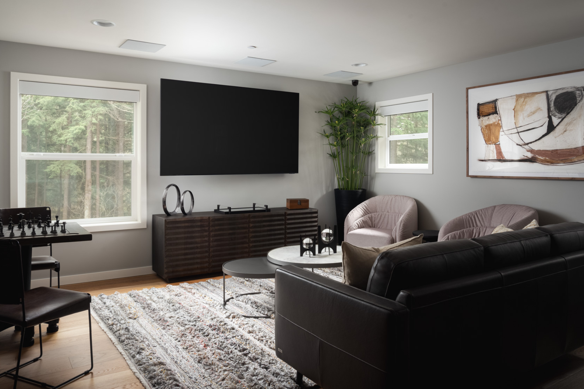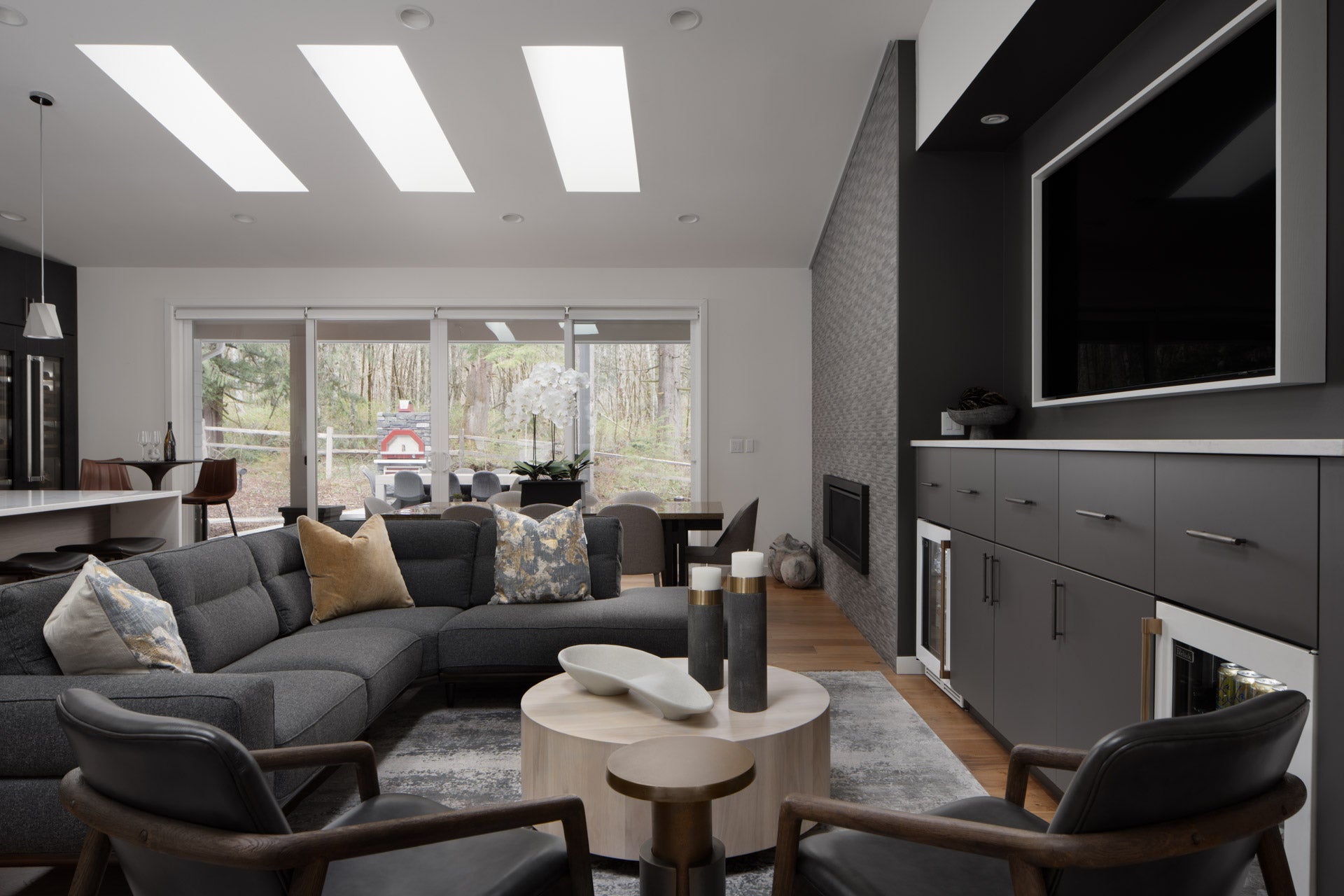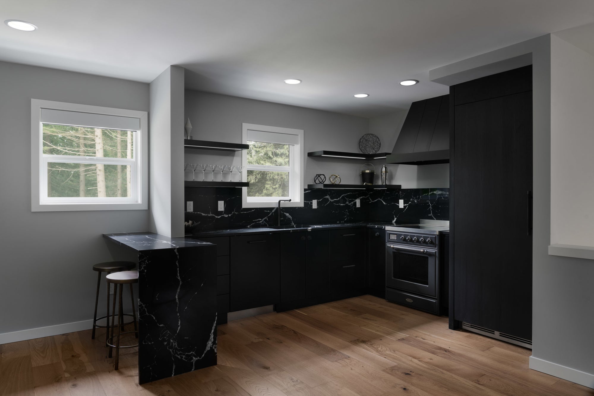Nestled in the serene landscape of the Pacific Northwest, the primary bedroom is where natural beauty meets refined comfort. Large window frames give you breathtaking views of the local evergreen trees, inviting the soothing essence of nature indoors.